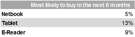 The netbook sector is set to be overtaken by tablets and e-readers, as more consumers responded they are likely to buy a tablet (13%) or e-reader (9%) than a netbook (5%) in the 6 months from June 2012. This indicates that consumers may be choosing alternative devices instead of netbooks.