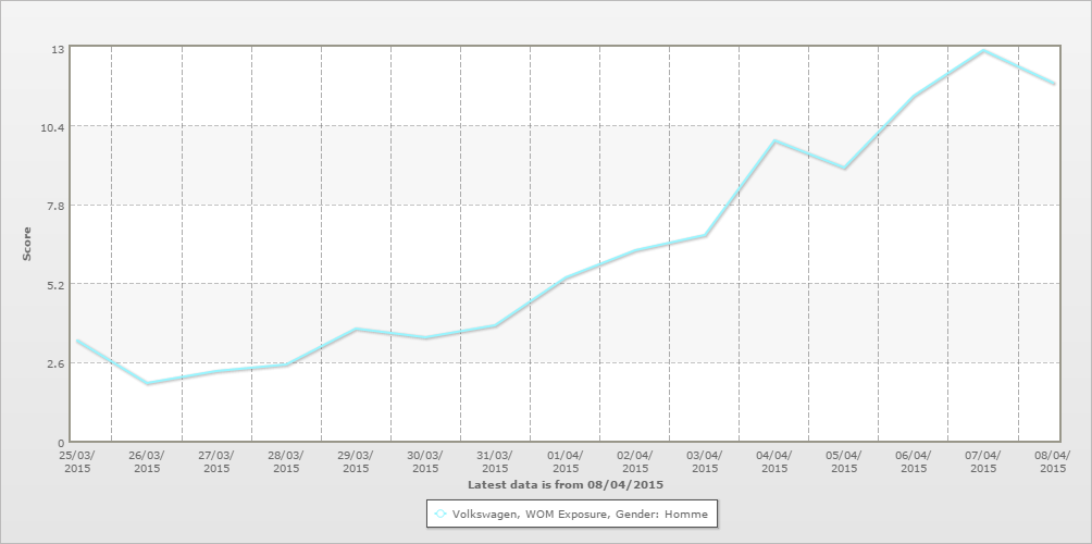 BrandIndex est un tracker quotidien de la perception des marques, qui analyse l’ensemble du funnel marketing pour plus de 450 marques en France avec 50 interviews par jour et par marque. Pour analyser les résultats de Volkswagen, le parti a été pris d'isoler les résultats quotidiens des hommes vivants en France entre le 25 mars et le 8 avril 2015 avec une moyenne glissante d'1 semaine qui nous permet d'avoir des bases solides avec un total d'environ 500 interviews.