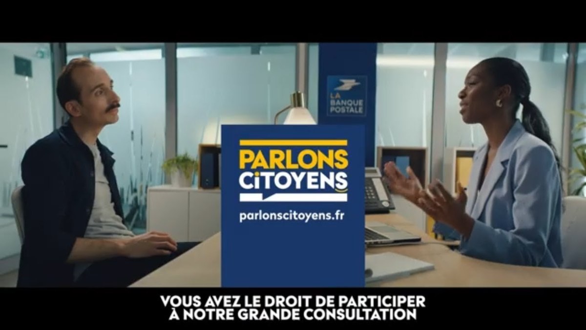 La Banque Postale lance un nouveau spot TV « Parlons citoyens » : une consultation auprès de tous les Français pour imaginer les services et produits de demain. Pour soutenir cette opération, la marque déploie une campagne TV signée Havas et réalisée par Géraldine Nakache. Trois films sont réalisés pour cette campagne : tous mettent en scène un conseiller de la Banque Postale demandant l’avis de son client mais donnant lieu à de drôles de quiproquos.